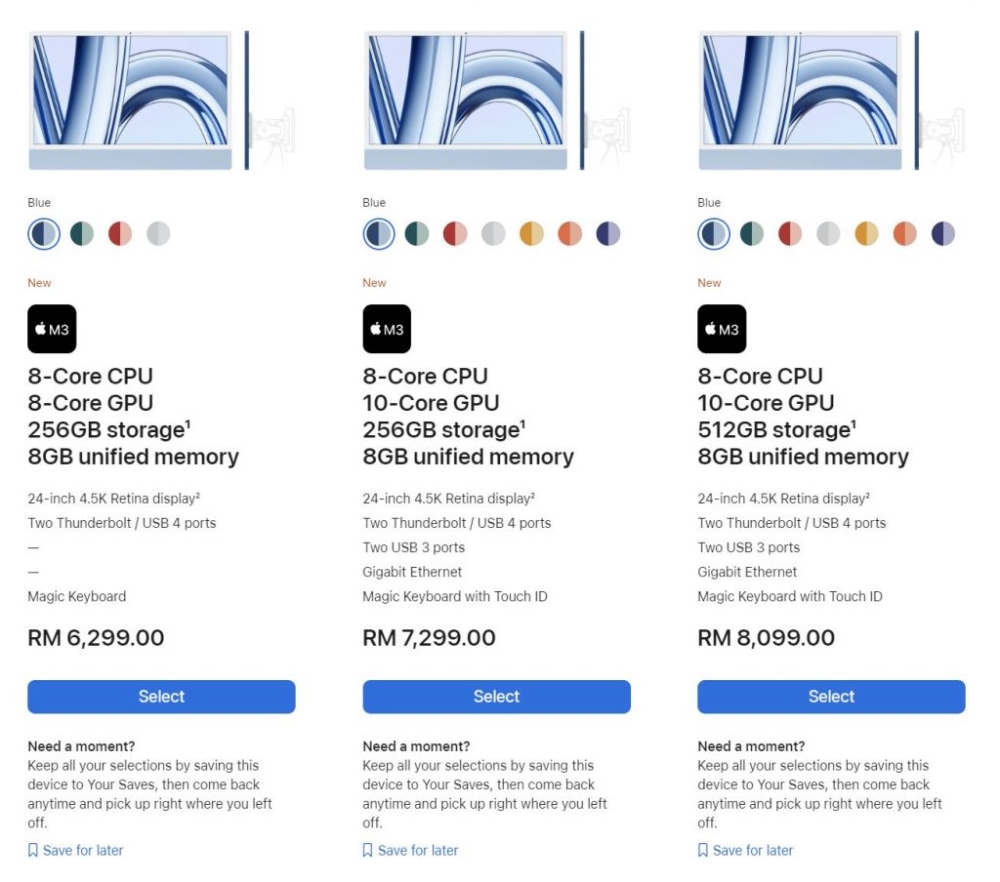 Similar to the previous iMac, the new 24″ iMac 2023 gets the base Apple M3 chip which comes with two GPU core configurations. Here’s the official Malaysian pricing for the three preset options before additional configuration: