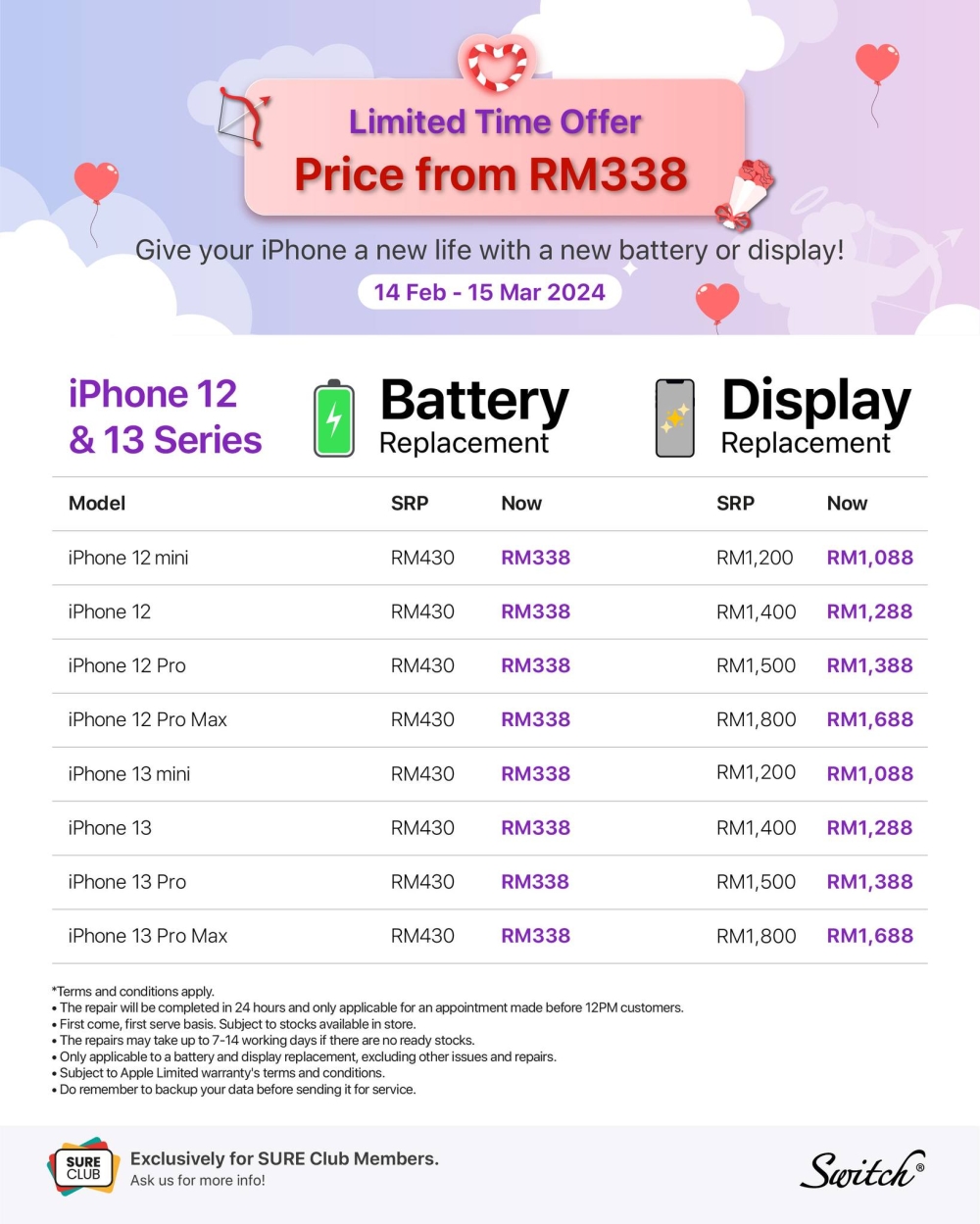 KUALA LUMPUR, Feb 14 ― If you have an older iPhone 12 or 13 series phone that needs some tender loving care, Switch is currently running a promotion from as low as RM338 for battery replacements and from RM1,088 for display replacements.