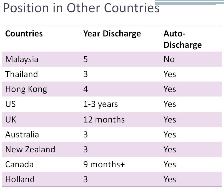 TeAM is proposing that the bankruptcy laws in Malaysia follow the more entrepreneurial economies such as Australia, Holland, New Zealand, the United Kingdom and the United States (see chart), and change its bankruptcy period to a maximum of three years, and then allow for an automatic discharge thereon.