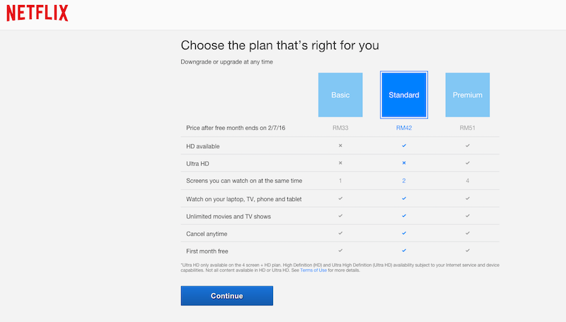 The Netflix monthly plan for Malaysia together with features that come with each tier are as follows: RM33 for Basic, RM42 for Standard and RM51 for Premium.