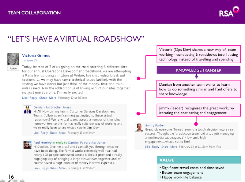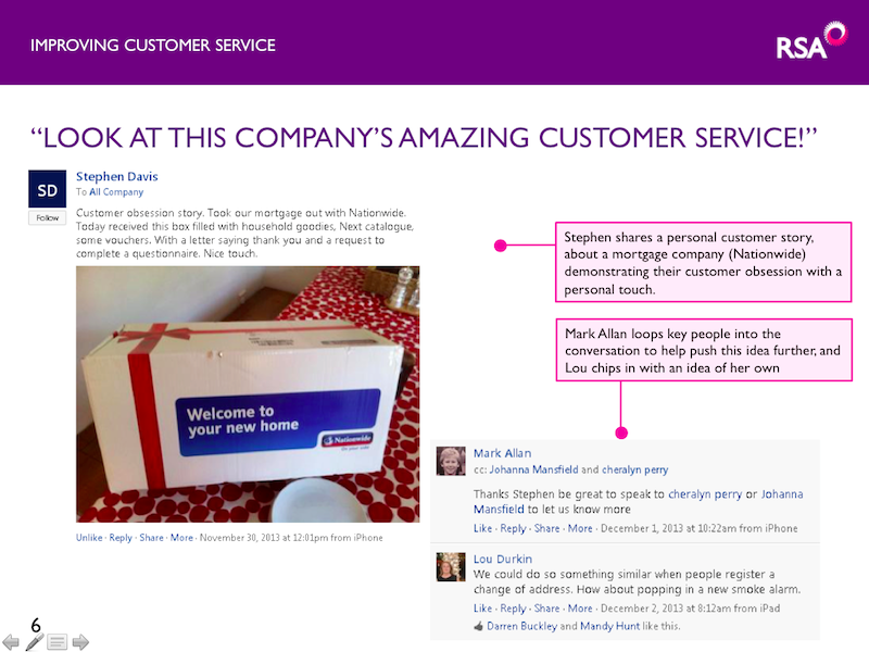 In one example, an employee shares a personal story of how he was impressed by how another company did customer service. A team leader saw the post and looped in key people to the conversation to help push this idea into an RSA’s customer service practices. Things were being done more quickly and effectively than ever, giving RSA a new edge in competitiveness.