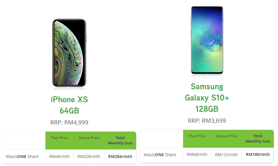 Maxis offers a variety of devices for MaxisONE Share subscribers which include Apple, Samsung, Huawei, Black Shark, Vivo and Xiaomi. The iPhone XS 64GB is going for RM208/month while the Galaxy S10+ 128GB is going for RM132/month.