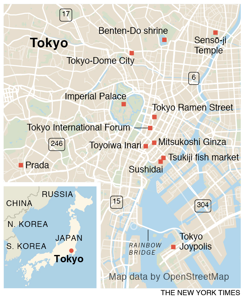 The meal (¥4,000) lasted less than an hour. Nonetheless it felt luxurious. It had been revealed slowly, piece by piece, the chef describing each in Japanese and in English. “Domo arigato,” I said, bowing to him and to the other two chefs farther down the bar. It was still morning. The day was ahead. The chefs sang out goodbyes as I slipped out the sliding door and into the crowd. — The New York Times