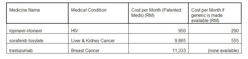 Malaysia already pays some of the most expensive medicines prices in the region. A 2013 study by Andrew Hill et al. presented at the International AIDS Society Conference for HIV Pathogenesis, Prevention and Treatment, for example, shows that Malaysia pays 10 times more for HIV drug lopinavir-ritonavir compared to countries in the same per capita national income category. The following table shows current prices for some medicine in Malaysia: