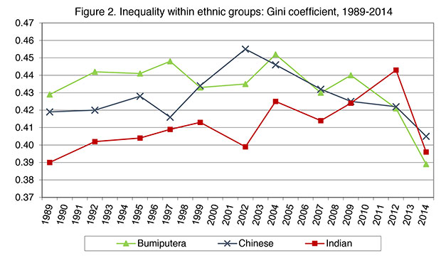 Take the inequality trend within the Indian Malaysian population (Figure 2). These figures are reported in the Household Income Survey Reports, but omitted in the Malaysia Plans. From 1989 to 2012 we observe a sustained increase – with some fluctuation – in disparities within the community: the Gini rises from 0.390 to 0.443.