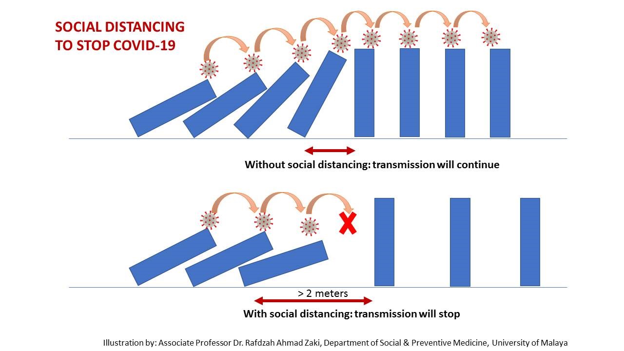 Imagine the spread of a virus is like the toppling of a line of dominoes. The domino effect will not stop until the chain is broken. Thus, the transmission of infection will continue to occur until we break the chain by increasing the distance between people.