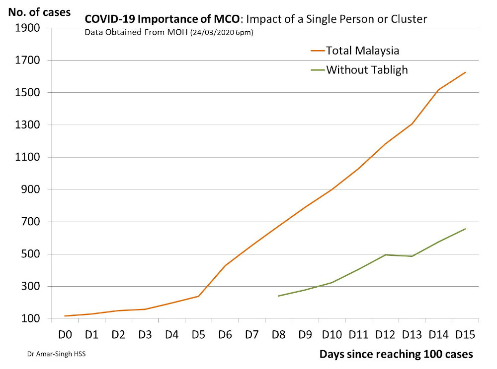 Every Malaysian has a part to play here. If even a small portion of our community (10 per cent) disregards the MCO, then we will be in crisis. As an example, see the graph below that shows the impact of just one person or one group on the entire epidemic in Malaysia. This is not to blame any individual or group but show us how each of us can make a significant difference in stopping this epidemic or inflaming it. The infection introduced into the tabligh convention accounts for more than half our national outbreak and continues to have ramifications in our country and is a super-spreading event for many neighbouring countries.
