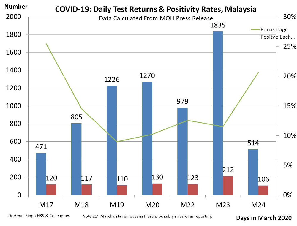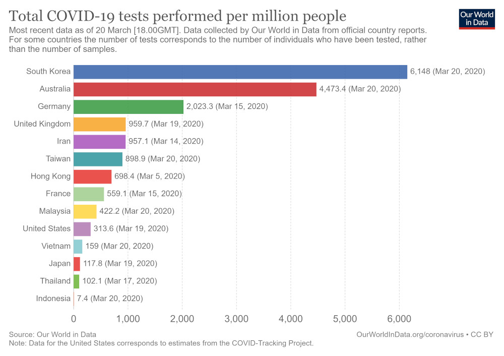 The second arm of our defence is testing. We need to identify all infected persons and quarantine them. I have spoken earlier about this but would like to highlight a little more on what is happening currently. The graph below shows the ‘test returns’ and ‘positivity rates’ each day for COVID-19, based on calculation on data obtained from MOH press releases. I am indebted to two Malaysians I have met online during this epidemic for thinking through this data with me and offering valuable insights (they have chosen to remain anonymous). The data is limited by the very large number of pending tests and we have no idea of private testing numbers. But the high positivity each day (10-20 per cent) indicates that we are still doing too few tests. You have to cast your net widely to pick up cases when the epidemic is spreading in the community (see my earlier article). Note in contrast that only ~ 3 per cent of South Korea’s coronavirus tests result in confirmed cases, ~ 1 per cent in Australia but ~16 per cent in Italy. The higher the positivity the weaker the testing strategy. The testing per million population graph from “Our World in Data” group also shows where we fare compared to others (caution that some data is older and countries may have improved).