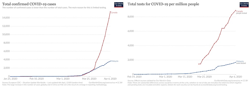 The number of tests we do determines the cases we find and report. If we compare Canada and Malaysia (below), a comparison I have seen online as our population sizes are similar, you will note (on the left) that they have many more cases than us. But also note (on the right) that they do a huge number of tests per million population compared to us. The stark similarity of both graphs speaks for itself. In this epidemic you get the numbers you test for.