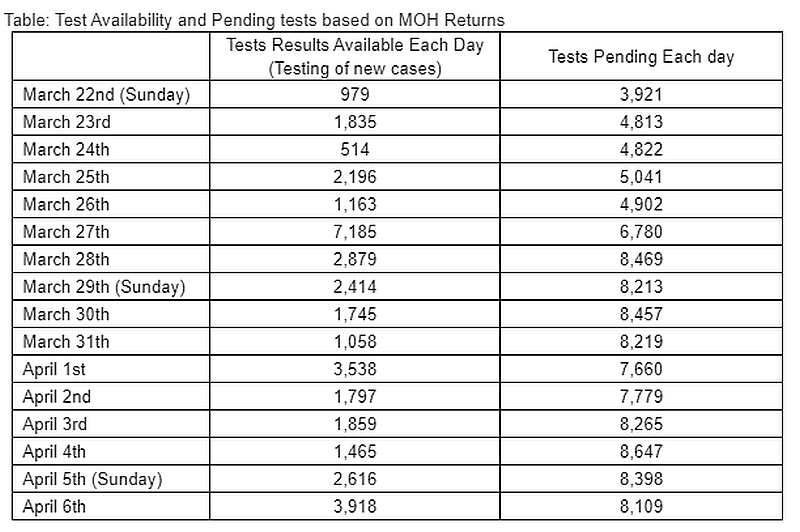 Except for one outstanding day (March 27), our test availability are generally between 1,500-3,500 each day. We have been informed by the Ministry of Health (MoH) that currently we can do 11,500 tests each day.