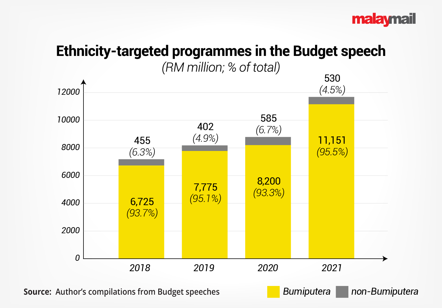 For Pakatan Harapan’s Budgets of 2019 and 2020, the Bumiputera share was only slightly lower, at 95.1 per cent and 93.3 per cent, respectively.