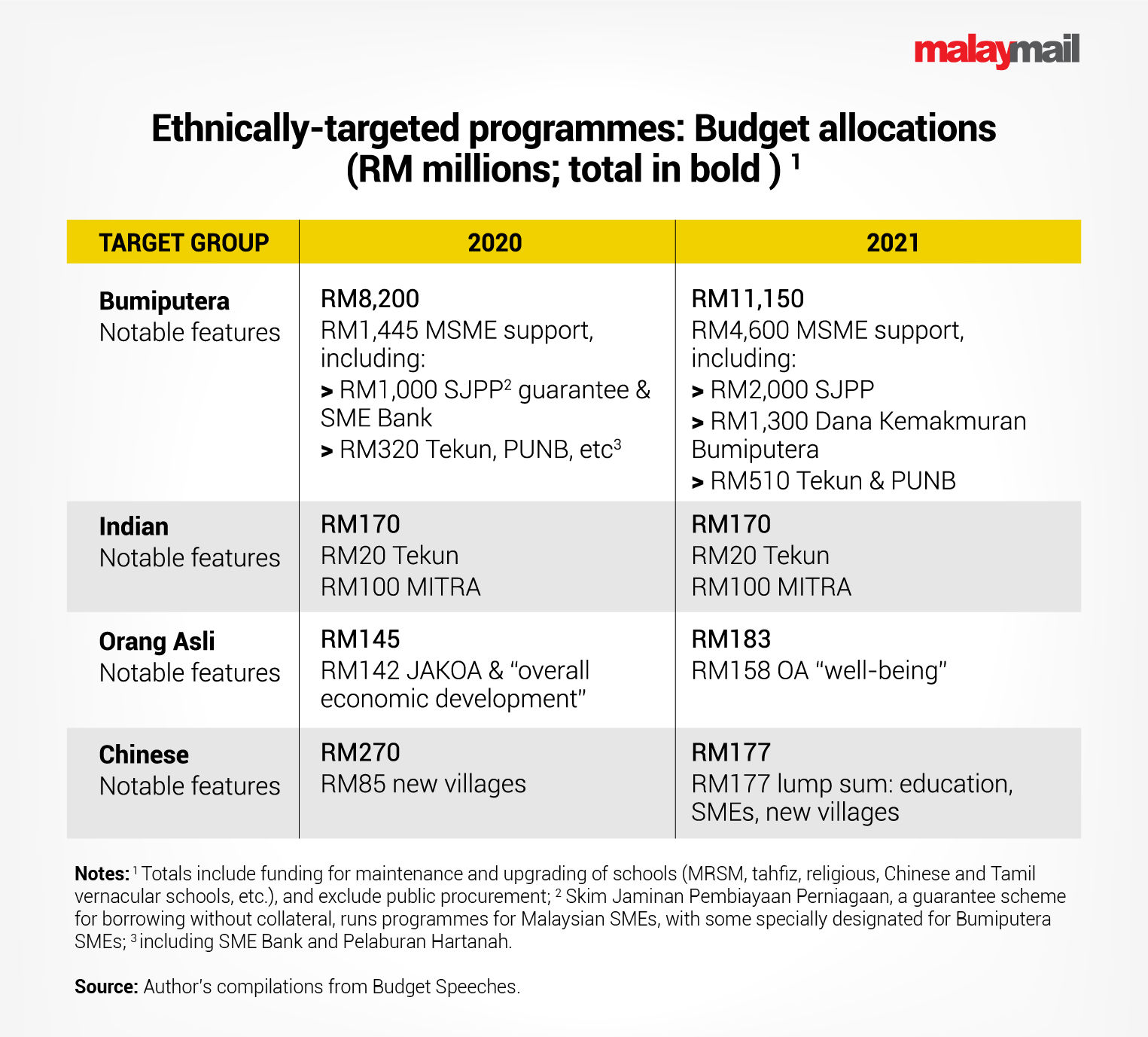 The table outlines ethnically-targeted programmes noted in current and preceding Budget speeches, and added a few informative notes. We can observe from these data that a large increase in funding for Bumiputera SMEs account for the bulk of the increase in the overall Bumiputera-targeted Budget – from RM8.2 billion in 2020 to RM11.1 billion in 2021.