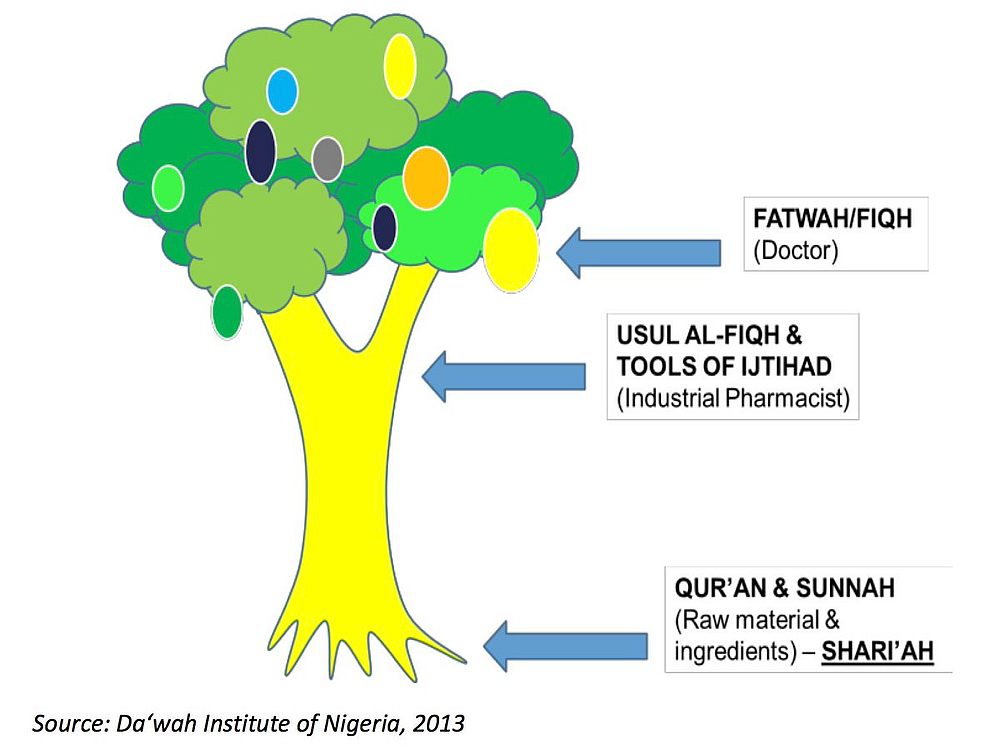 The trunk and branches rep the tools & methodologies (Usul al- iqh/foundations of Fiqh & Maqasid/Objectives) used by scholars to derive the fruits (fatwas/rulings)