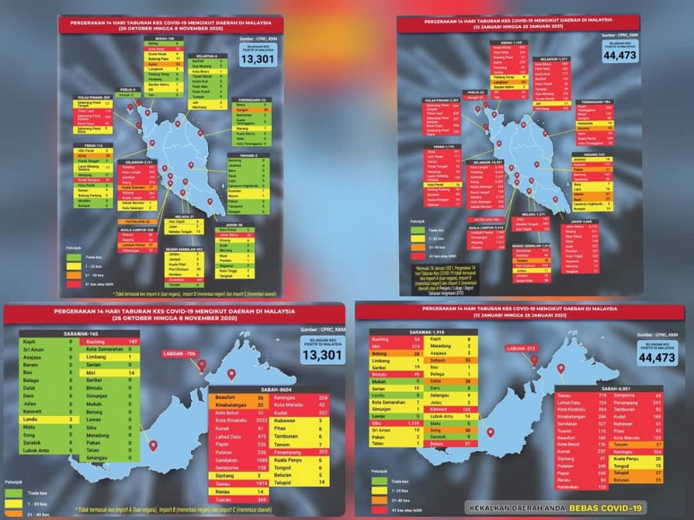 As of January 25, the total number of active Covid-19 cases is 41,074. This time, there are zero green zones left in the peninsular while East Malaysia only has six green zones left.