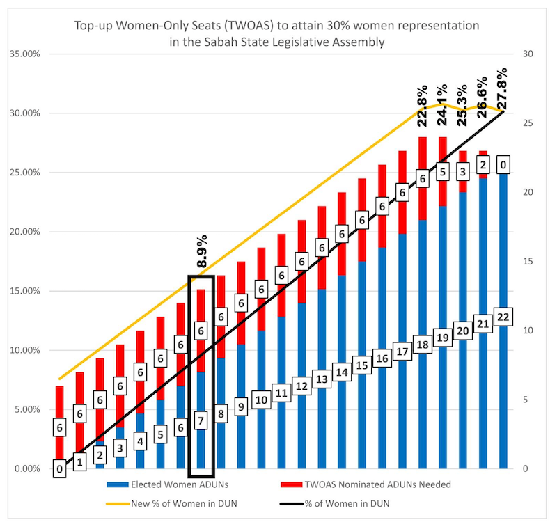 If less than 22 women are elected, the necessary 2-6 slots of TWOAS would be shared by the parties based on their vote share. If any TWOAS representative jumps to another party, the seat will be filled by the next candidate from the same party, hence, immune from party-hopping by the likes of Jaffary Waliam. This would encourage parties to invite credible women leaders to stand as TWOAS candidates. Sabahans can also reject parties that put up bad TWOAS candidates in their ADUN votes.