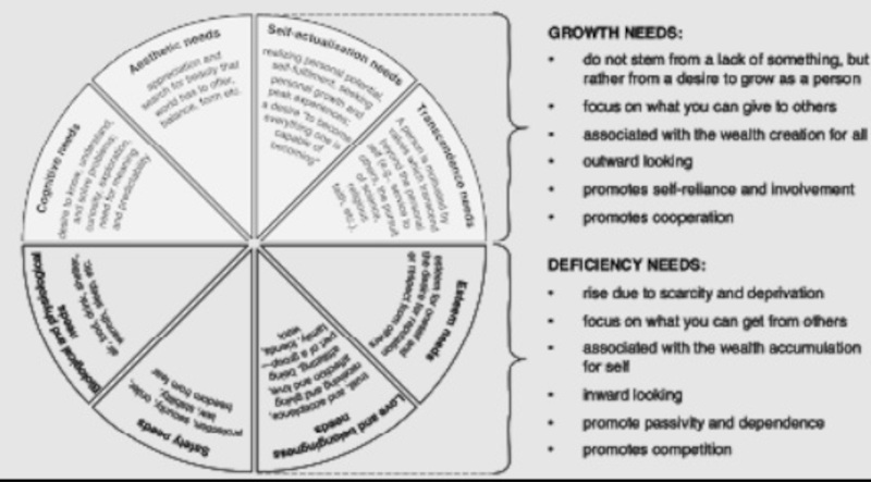 The deficiency needs arise due to scarcity of resources, are fuelled by our self-interest and focus on the accumulation of material possessions, often in a competitive manner. On the contrary, the growth needs do not stem from scarcity but create abundance. These needs have an ultimate outward focus on wealth creation for the selves and, importantly, for others done in the spirit of cooperation and respect for the dual value of life (our own life and lives of others).