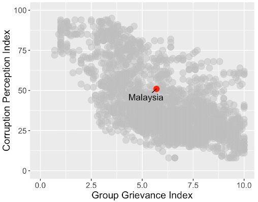 The figure below plots the Corruption Perception Index against the Group Grievance Index worldwide over the past ten years. The Group Grievance Index serves only as a proxy to capture an extent of the ugly manifestation of identity politics in an individual country. This index takes into account such indicators as the extent of divisions and schisms along social and political axes, harmony of inter-group relationships and equality of access to various national resources, among others.
