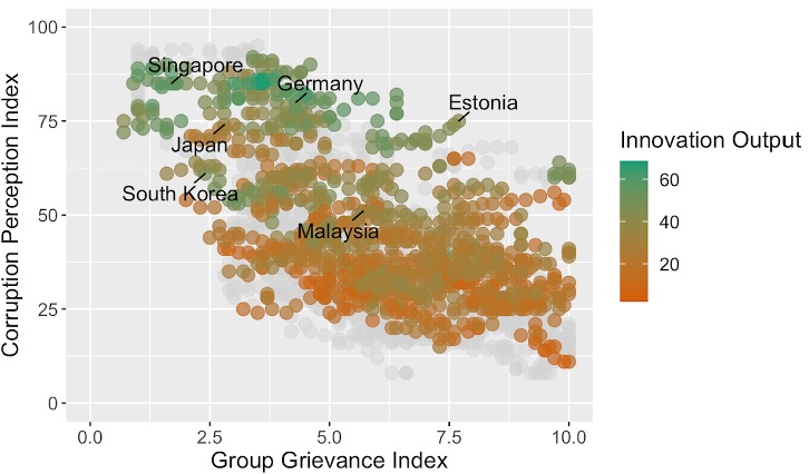 Technology innovation might be a crucial third variable that propels these countries to the top of the graph. They have learned how to apply 4IR tools to curb corruption and poisonous identity politics through radical transparency, accountability, and participative governance models enabled by 4IR technologies. Resulting lower corruption and greater national unity breed even more innovation, and this is how the virtuous cycle of prosperity is created!