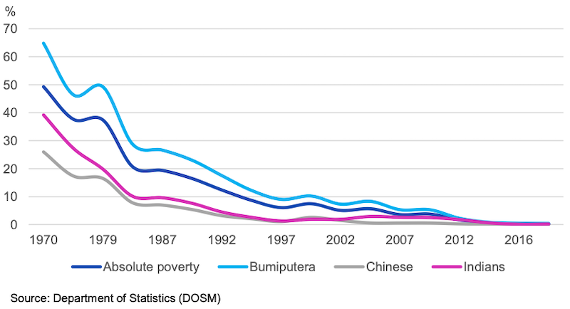 When it comes to poverty, it can be observed that the NEP was effective in reducing the poverty rate significantly for all races (chart below).