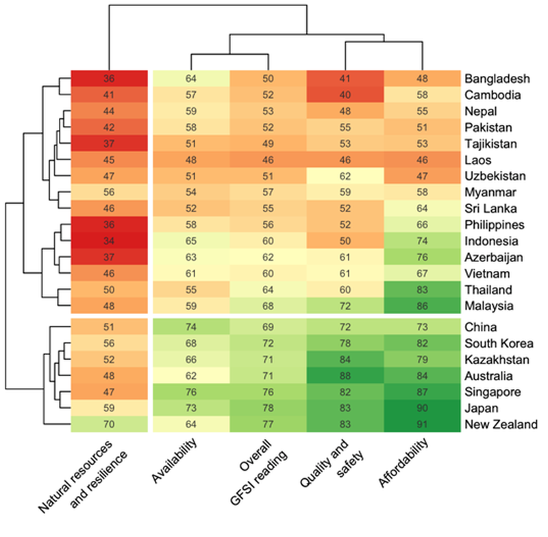 The following plot summarises the GFSI (overall reading and dimensions) for the Asia-Pacific region in 2020. The green dominated rows on the graph belong to countries that scored more favourably on nearly all food security dimensions.