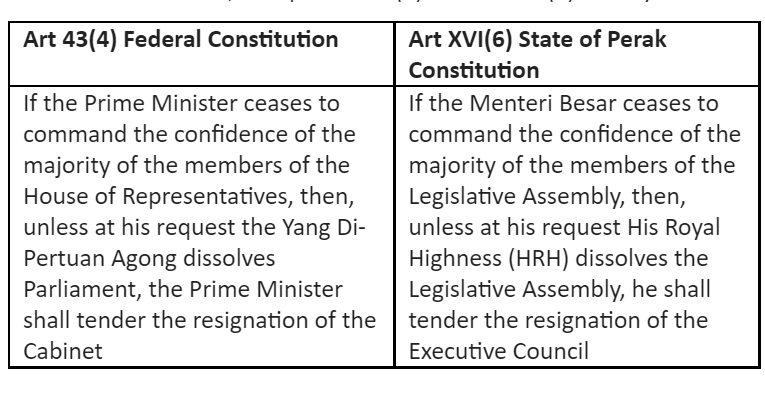 “If the Menteri Besar ceases to command the confidence of the majority of the members of the Legislative Assembly, then, unless at his request His Royal Highness (HRH) dissolves the Legislative Assembly, he shall tender the resignation of the Executive Council.”