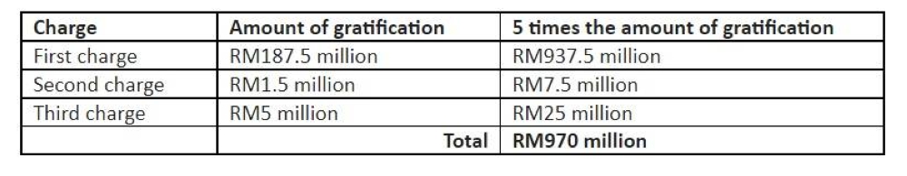 The fine of RM970 million is five times the sum of the gratification. The breakdown is given in the judgement of the court as follows:
