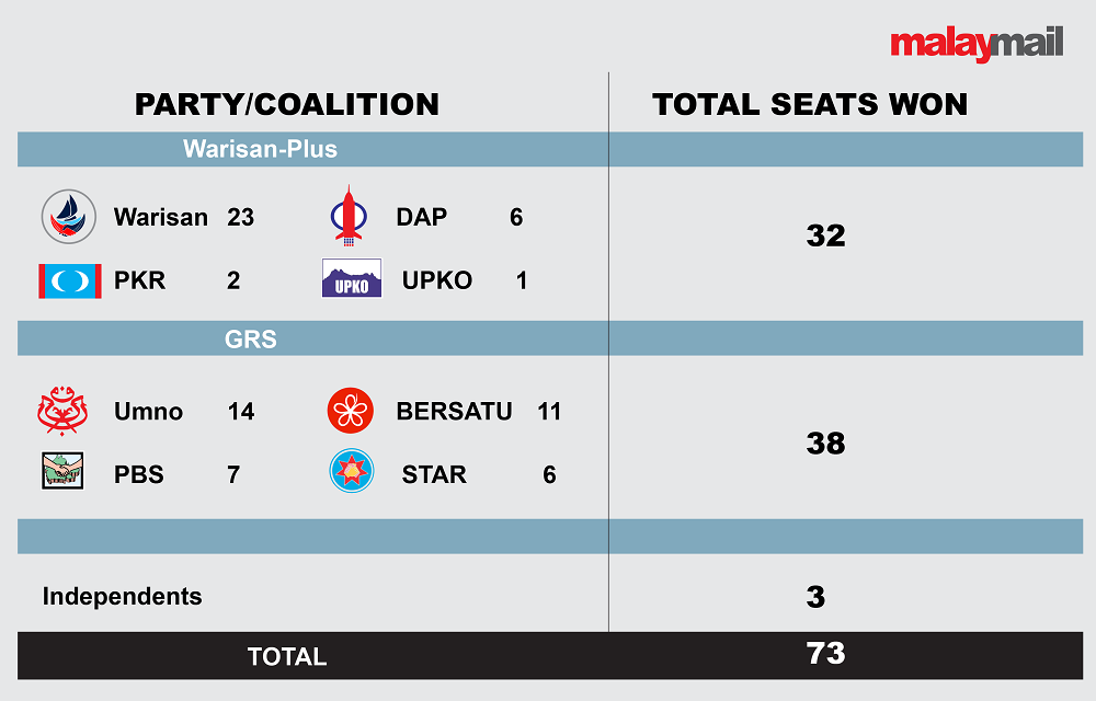 GRS secured 38 seats and obtained a simple majority in the SLA. Warisan-Plus won 32 seats. Three other seats went to independent candidates. In terms of the popular vote, Warisan-Plus had a slight edge over GRS, winning 43.42 per cent, or 317,541 votes.
