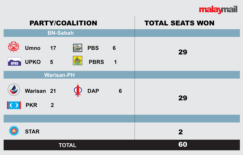 Another coalition of three political parties, Warisan-PH (Warisan, DAP and PKR) led by Shafie also won 29 seats. The remaining two seats were won by STAR.