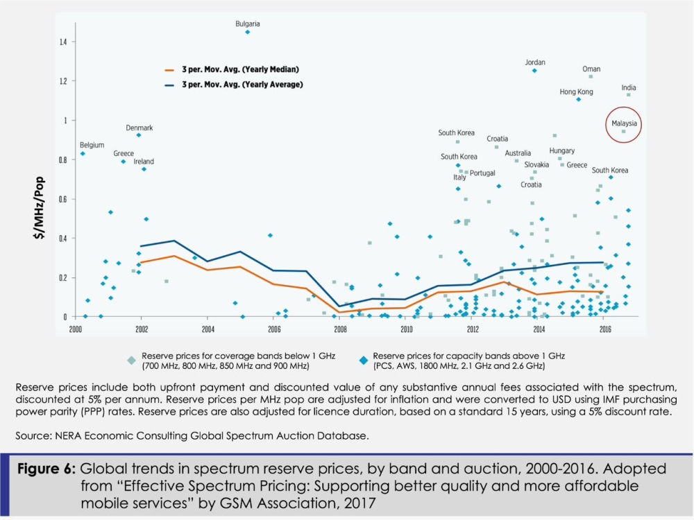And all of the above is even though Malaysian MNOs have lower spectrum holding than their global and regional peers (Figure 5), which is also unduly highly-priced (Figure 6), according to the NERA’s (see the report by GSMA “Effective Spectrum Pricing: Supporting better quality and more affordable mobile services”).