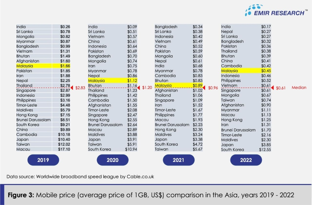 Furthermore, this is congruent with the data collected by Worldwide Broadband Speed League for the mobile price calculated as an average price of 1GB in US$ (Figure 3), where it is seen that Malaysian mobile internet remained much more affordable compared with many Asian peers.