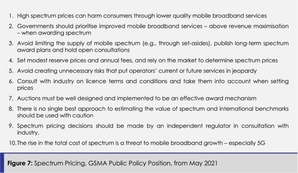 GSMA was very clear in its negative position on spectrum over-pricing and withholding (see “Spectrum Pricing, GSMA Public Policy Position” from May 2021) (Figure 7).