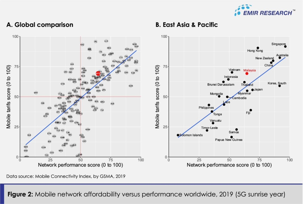 Consistently, as of 2019 (just before the DNB’s saga), Malaysia was not only ahead of its most regional peers (Figure 2B) but the majority of other middle-income nations in terms of quality and affordability (Figure 2A).