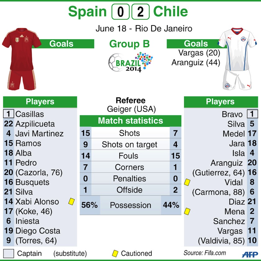 On the day when Spain’s King Carlos also signed his abdication papers, Spain’s footballers left their throne as goals from Eduardo Vargas after 20 minutes and Charles Aranguiz two minutes before halftime earned Chile a stunning victory.