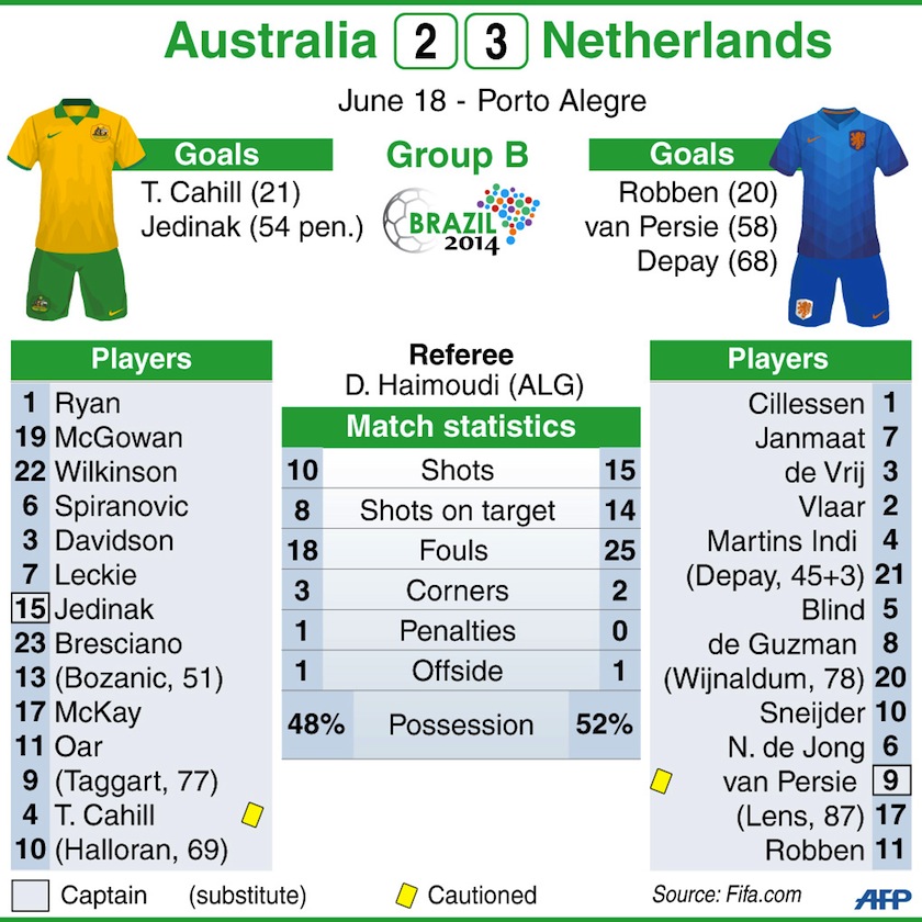 The Dutch had not beaten Australia in three previous meetings but that oversight was corrected with a thrilling 3-2 World Cup Group B win secured by a long-range strike from substitute Memphis Depay.