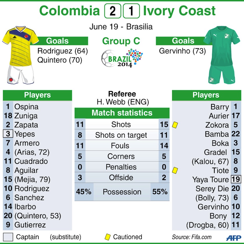 James Rodriguez beat Ivory Coast substitute Didier Drogba to a corner with a powerful header for the first goal before Juan Quintero coolly netted a second in a 2-1 win that put Colombia on six points and in control of Group C.
