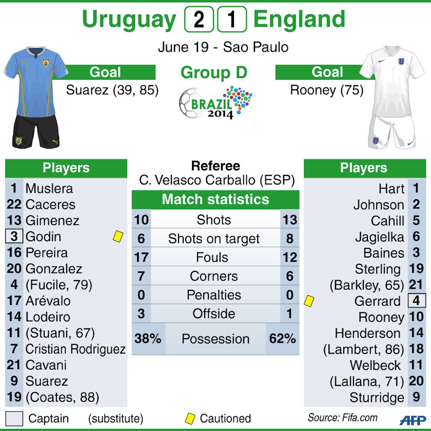 Uruguay joined Italy and Costa Rica, who meet on Friday, on three points with England on zero after two losses in Group D.