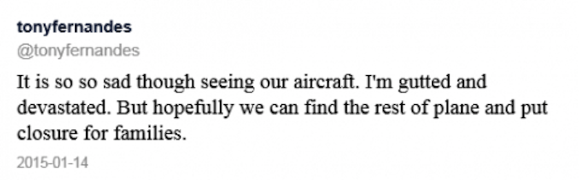 Following the discovery of the fuselage, AirAsia group chief executive Tony Fernandes tweeted: “It is so so sad though, seeing our aircraft. I’m gutted and devastated. But hopefully we can find the rest of (the) plane and (have) closure for families.” — TODAY