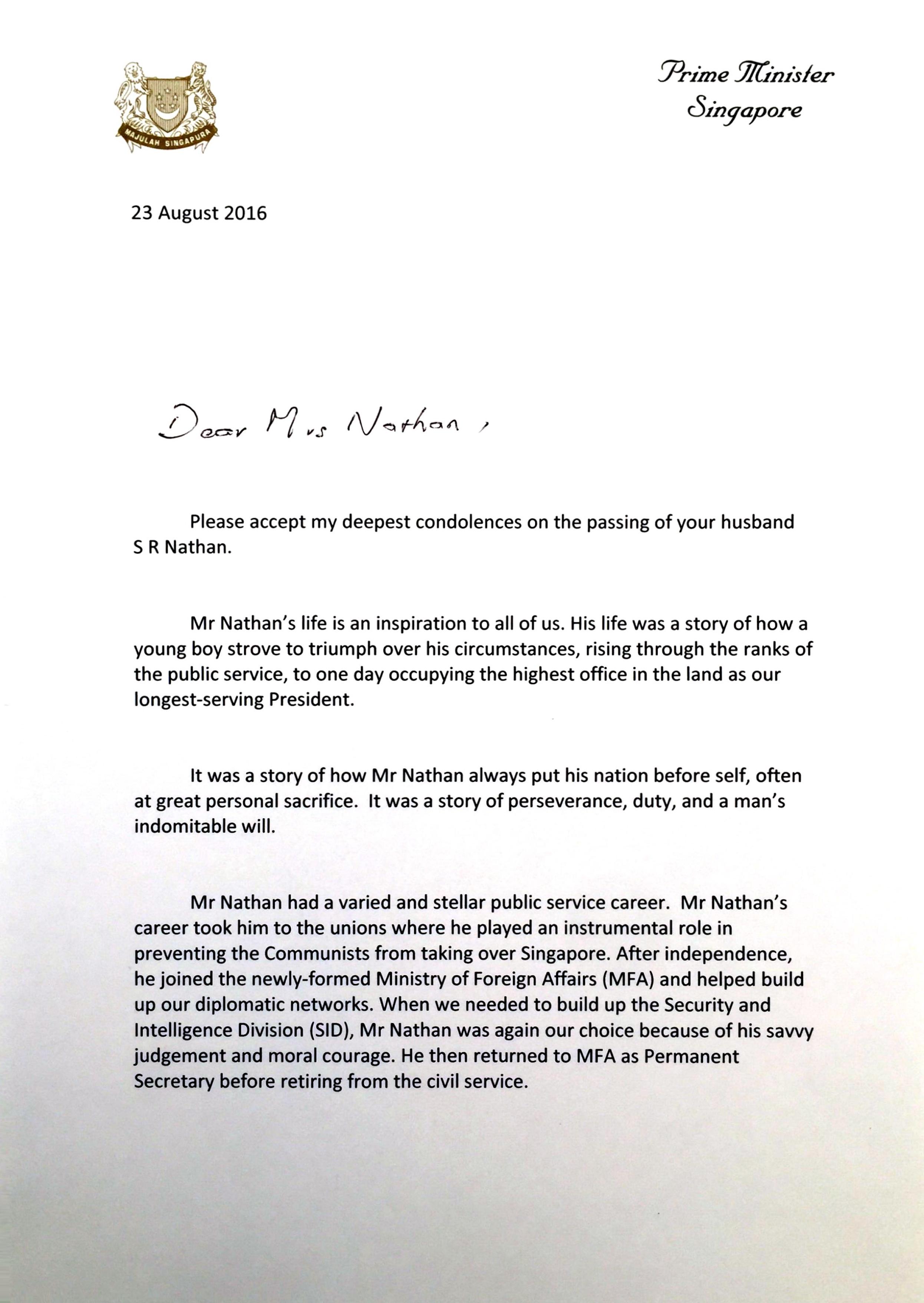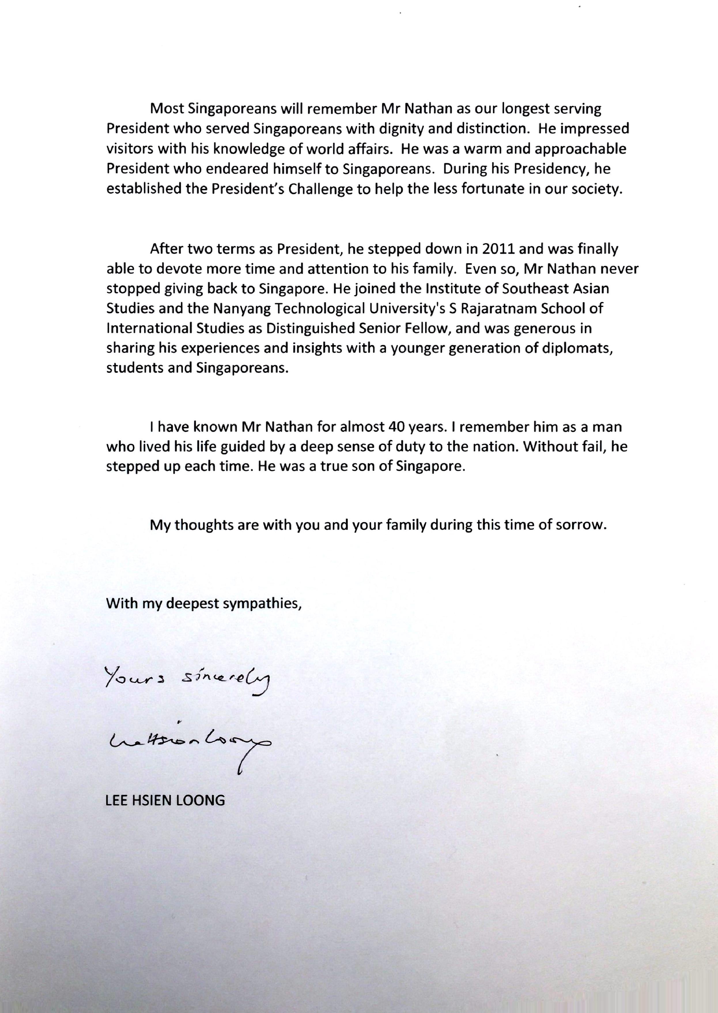 SINGAPORE. Aug 23 — Former President SR Nathan is “an inspiration to all of us”, Prime Minister Lee Hsien Loong said in a condolence letter to Mrs Nathan today.