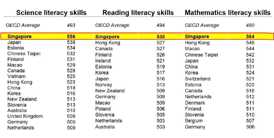 This is the first time Singapore has clinched the first spot in all categories in the Programme for International Student Assessment (PISA) since it started participating in the study in 2009. This stella showing comes merely a week after Singapore also took pole position in all four charts in the Trends in International Mathematics and Science Study (TIMSS), a test that assessed 10- and 14-year-olds’ math and science abilities.