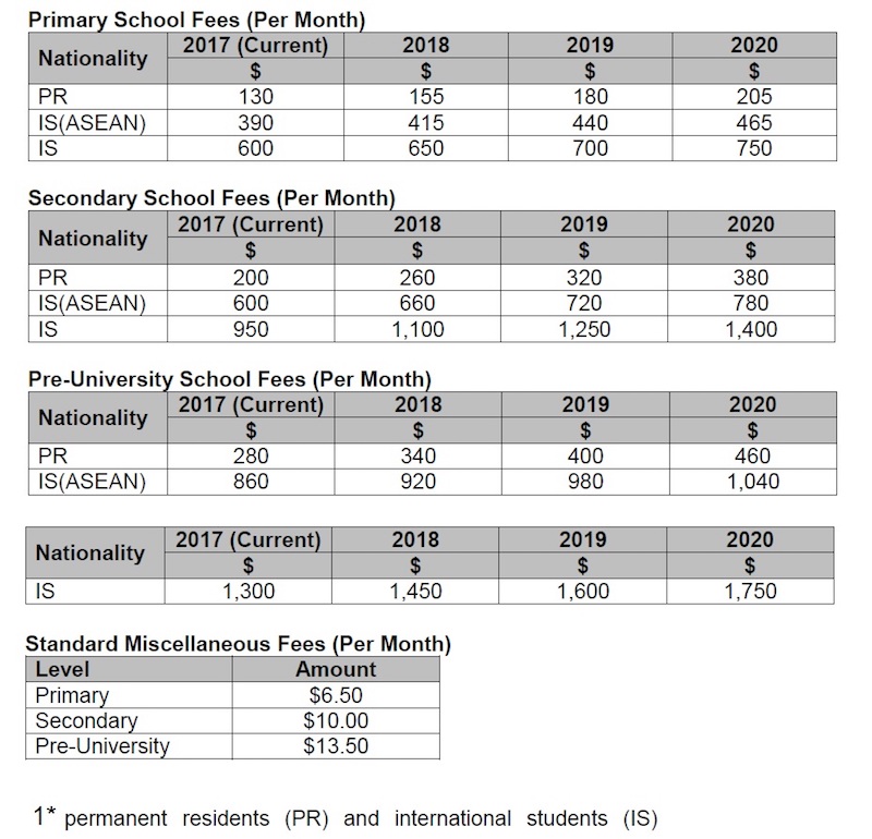 For instance, monthly fees for a permanent resident attending a primary school here will go up from S$130 now, to S$155 next year, to S$180 in 2019, and S$205 in 2020.