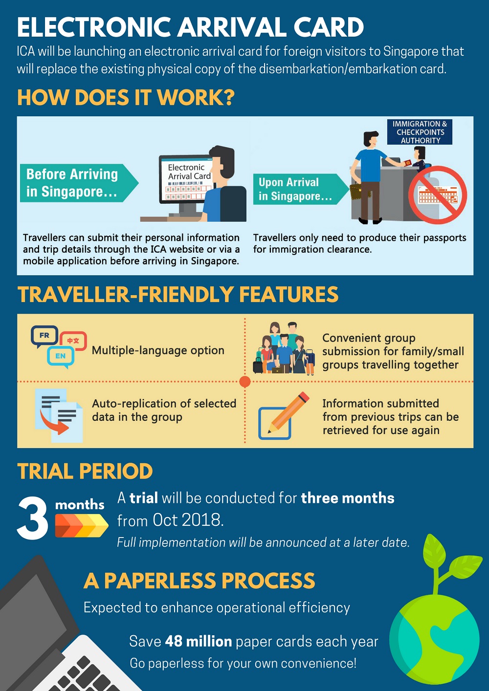 - The electronic arrival card that they filled up in advance will then be called up by ICA’s immigration system.