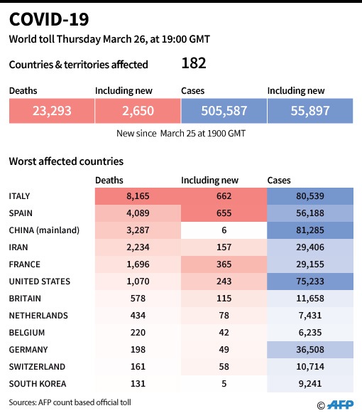 NEW YORK, March 27 — The United States yesterday surpassed China and Italy as the country with the most coronavirus cases, according to a Reuters tally, as New York, New Orleans and other hot spots faced a surge in hospitalisations and looming shortages in supplies, staff and sick beds.