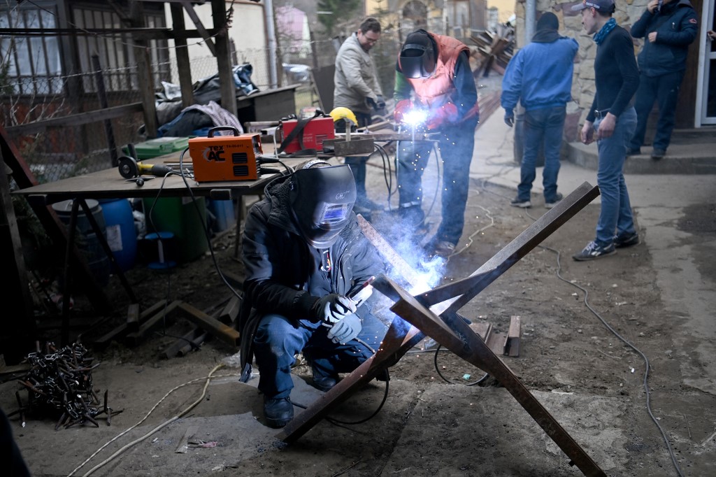“Look at that, 1914!” laughs Vitali Bodnar, cigarette in mouth and welding helmet raised. That’s the year of manufacture of the metal obstacles they are recreating.
