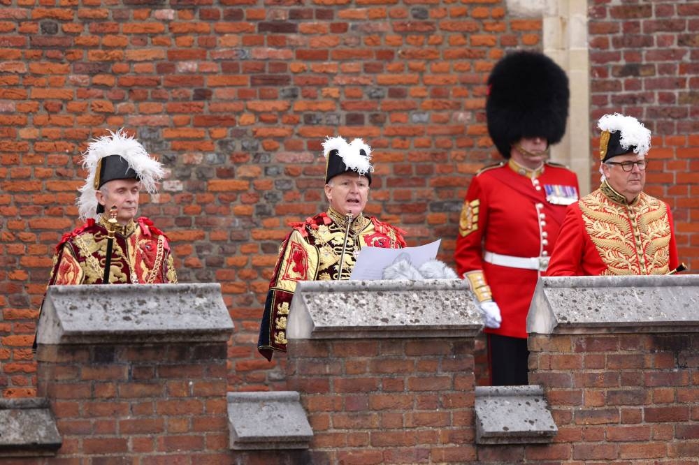 Later, on the Proclamation Gallery, a balcony above Friary Court of St James’s Palace, the Garter King of Arms, David White, accompanied by others in gold and red heraldic outfits read out the Principal Proclamation, as trumpeters sounded.