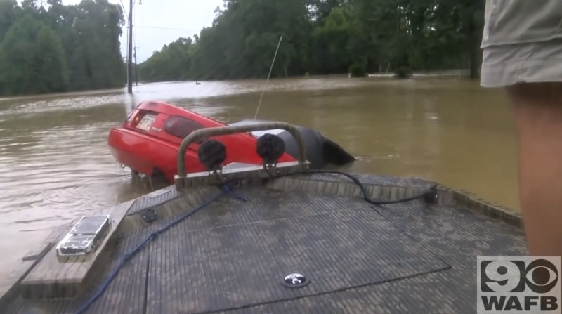 Man jumps into floodwaters to rescue a woman and dog trapped in car (VIDEO)